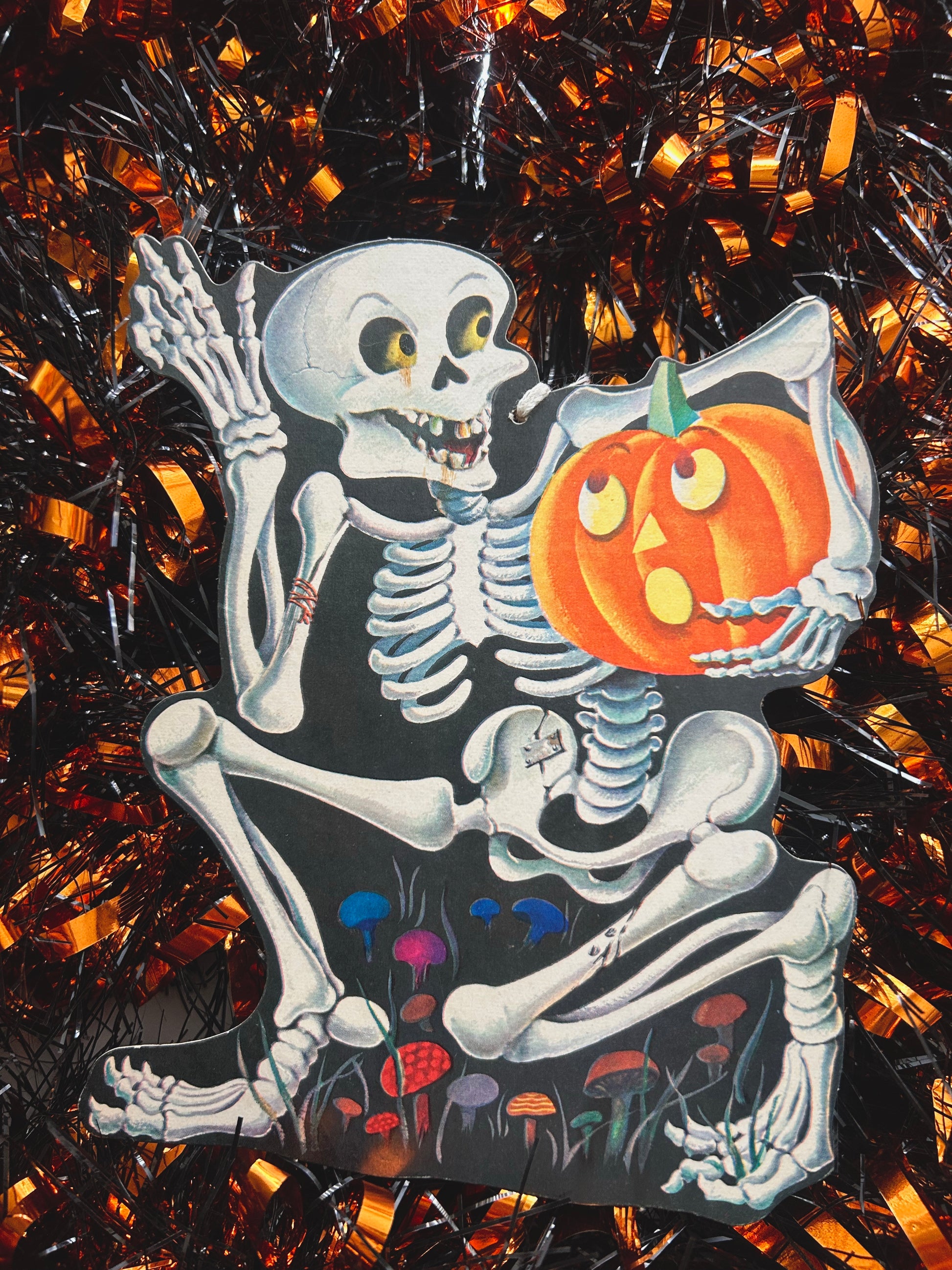 Featuring Vintage Dennison Small Scared Jack O Lantern carried by Skeleton Diecut Decoration. 1960’s Has a small mark across face as seen in photos but almost looks like it’s supposed to be there