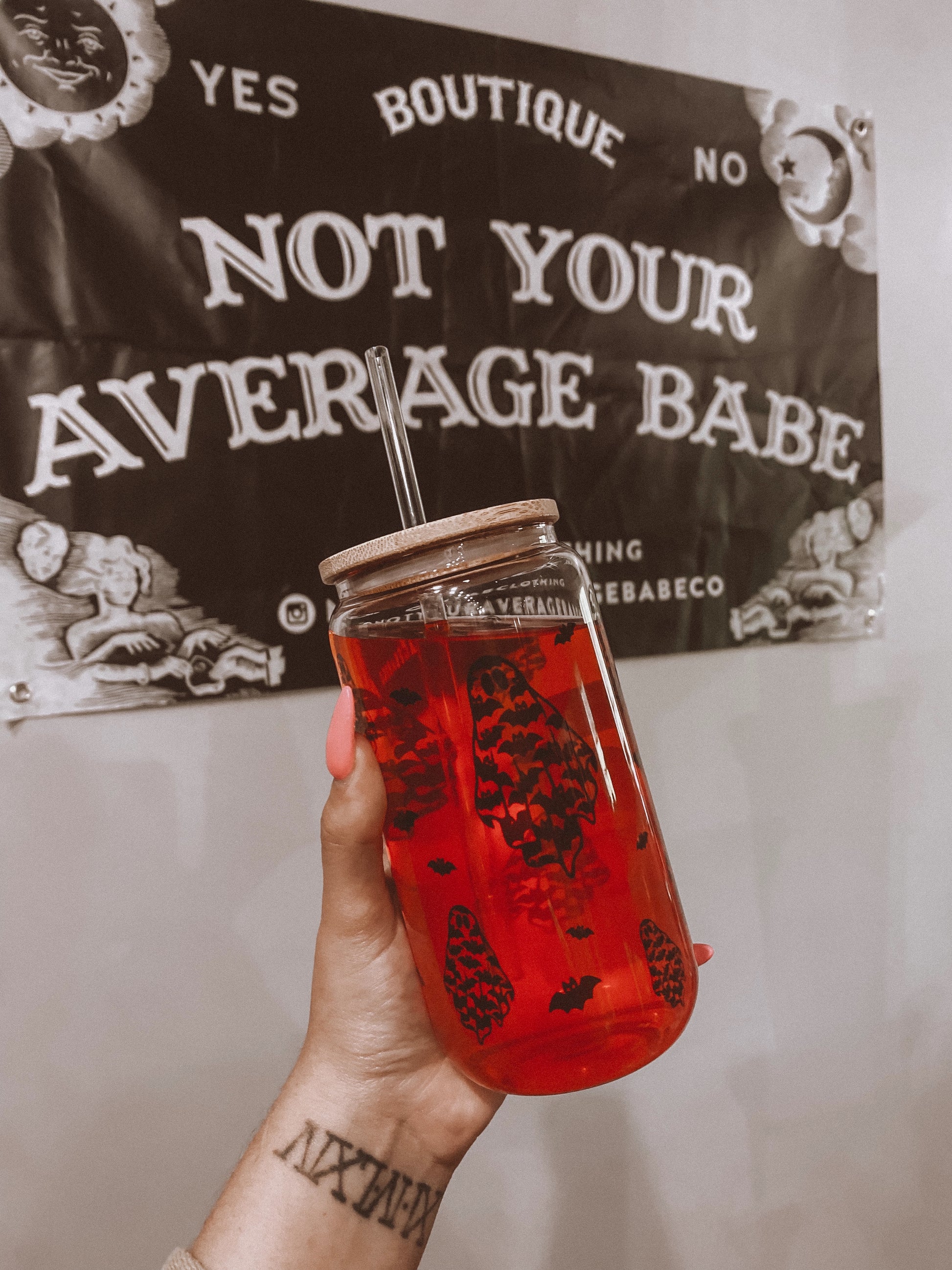 Our Ghost glass tumbler is 16 Oz with a straw + bamboo lid! These are sublimated (no vinyl, no peeling) right in our warehouse