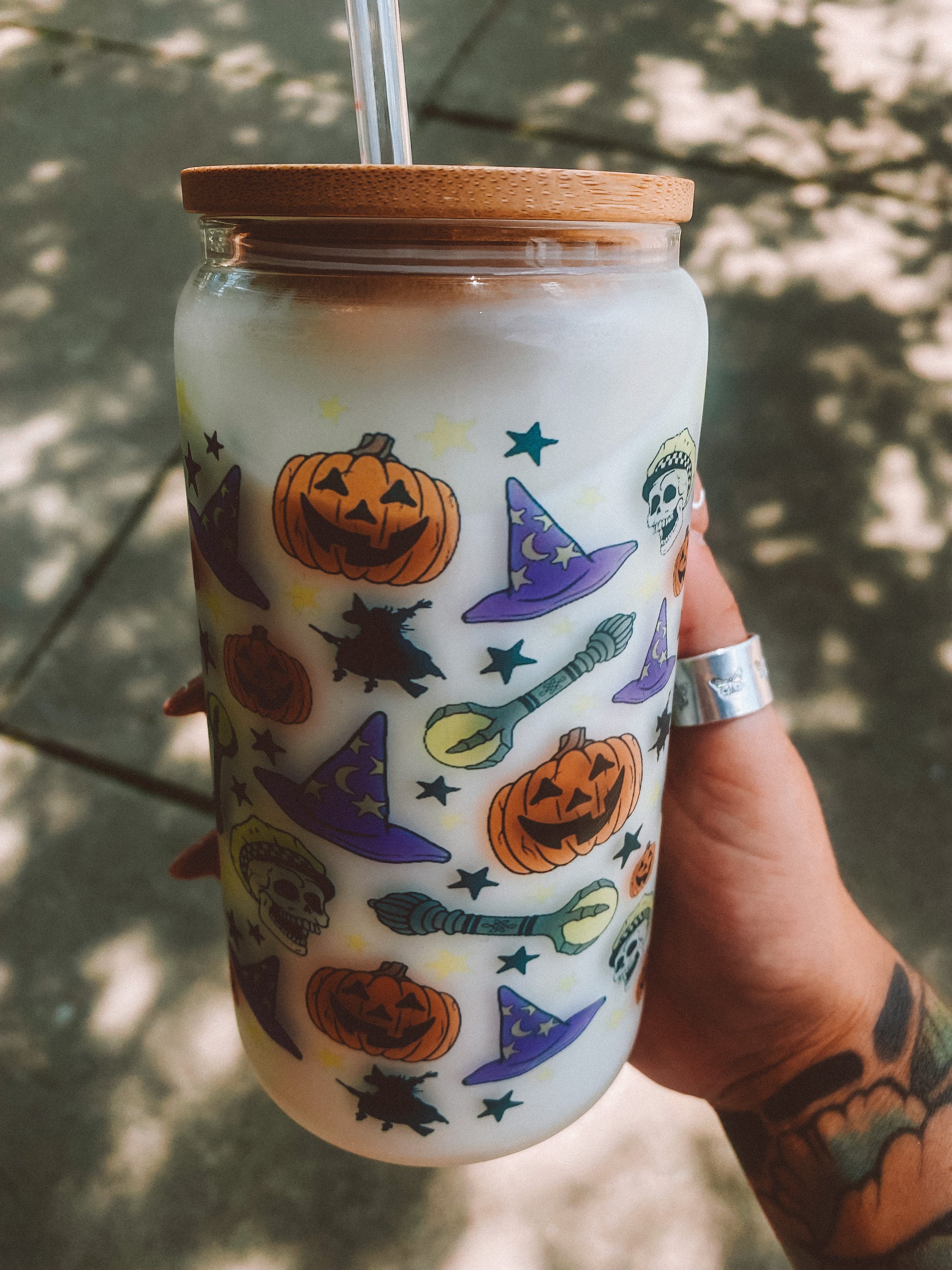 Our Halloweentown-inspired glass tumbler is 16 Oz with a straw + bamboo lid! These are sublimated (no vinyl, no peeling) right in our warehouse
