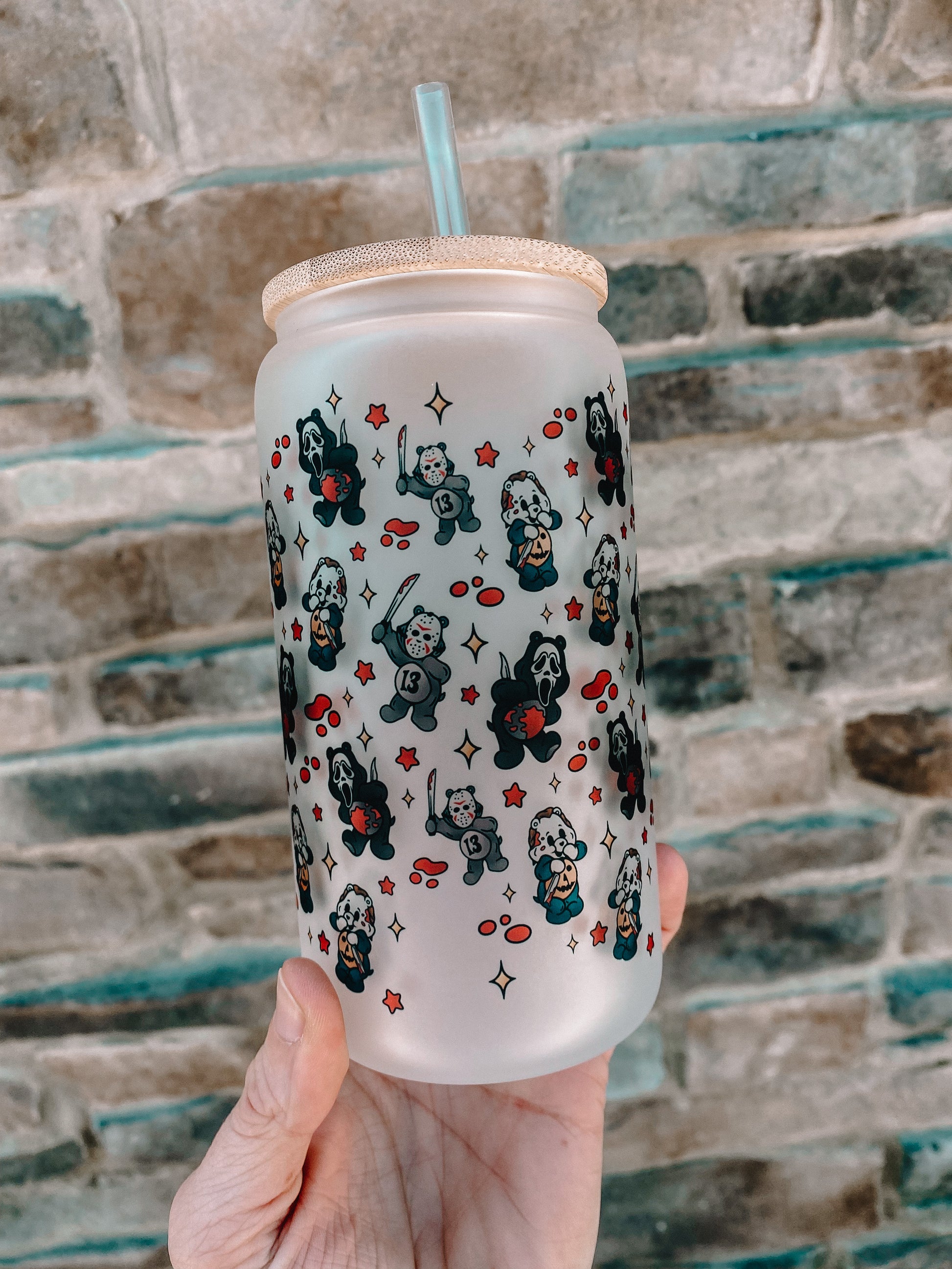 Our Scare Bears glass tumbler is 16 Oz with a straw + bamboo lid! These are sublimated (no vinyl, no peeling) right in our warehouse!