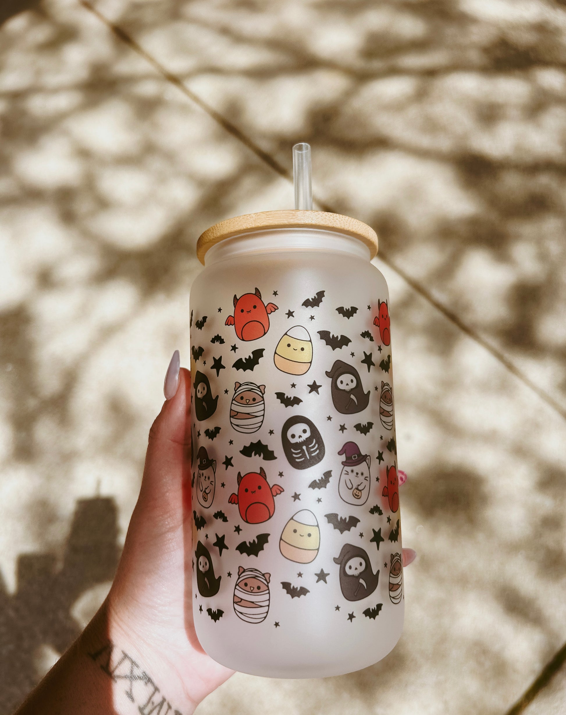 Our Squishmallows glass tumbler is 16 Oz with a straw + bamboo lid! These are sublimated (no vinyl, no peeling) right in our warehouse!