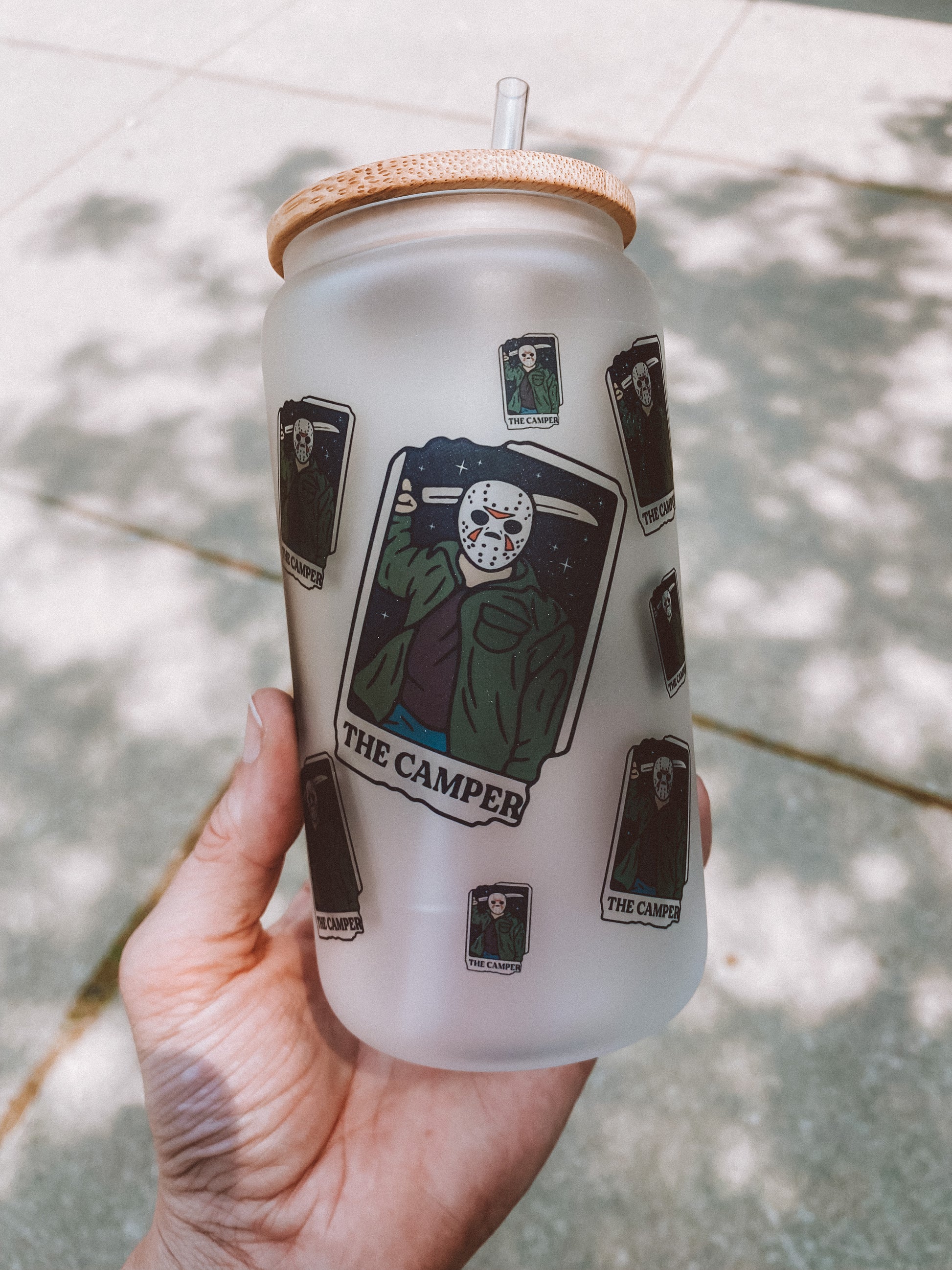 The Camper Tarot Glass Tumbler is 16 Oz with a straw + bamboo lid! These are sublimated (no vinyl, no peeling) right in our warehouse!
