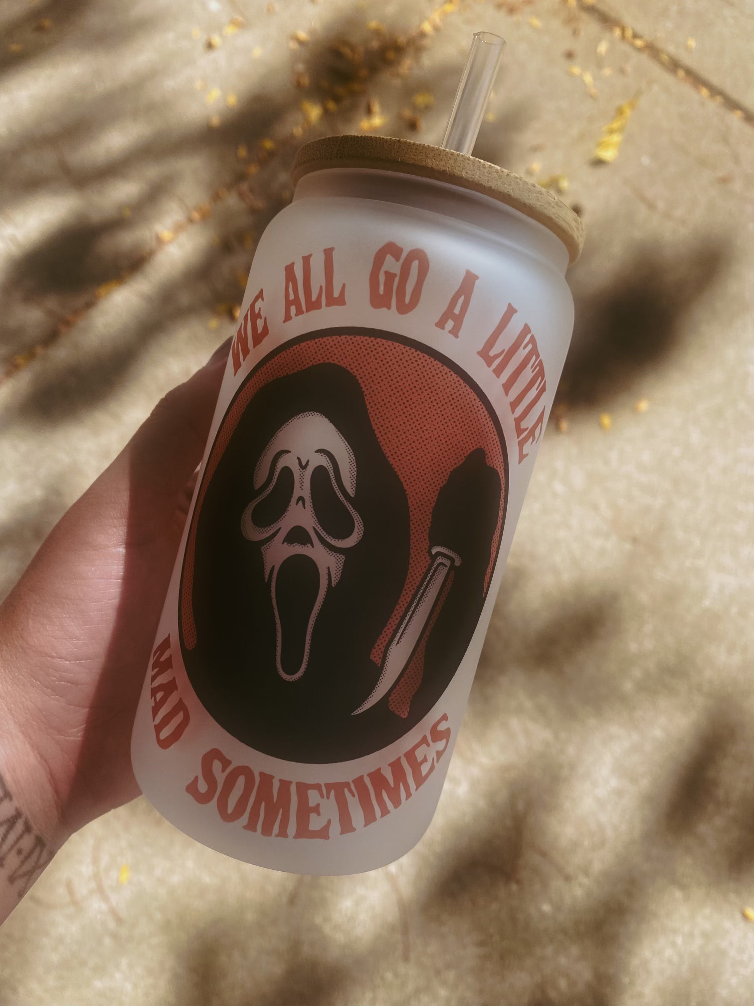 Our “We All Go a Little Mad Sometimes” frosted glass tumbler is 16 Oz with a plastic straw + bamboo lid!